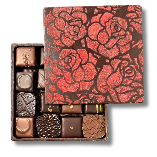 Coffret entièrement réalisé en chocolat noir 65% garni d’un assortiment de 150g de chocolats fins, ganaches et pralinés.